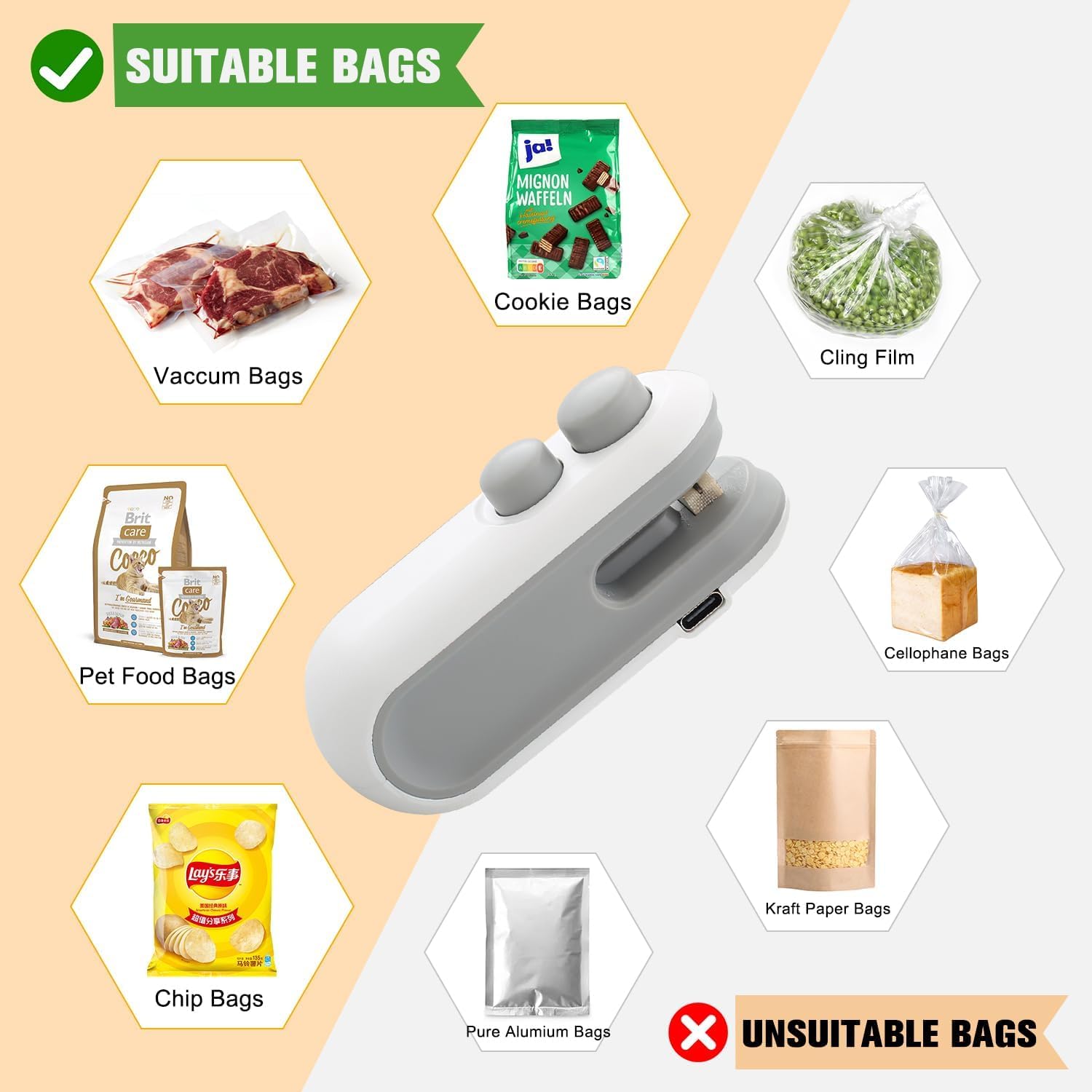 【2-IN-1 SEALER AND CUTTER】This vacuum sealer mini two useful tools that act as both a sealer and cutter. You can use it to cut snack bags or other bags and then seal them again using the chip bag sealer. The 2-in-1 bag sealing tool makes life easier. 【KEEP FOOD FRESH】Plastic bag sealer allows you to seal food bags. Keep food fresh and keep bugs out. Avoid air humidity and keep food dry. Portable sealer machine mini is a good helper in the kitchen of your life. 【LANYARD & MAGNETIC】This portable plastic sealer a magnetic surface and lanyard. Therefore, you can attach it to the refrigerator or hang it on a hook without worrying about taking up too much space. 【EASY TO CARRY AND PLACE】The snack sealer is very mini, you can easily put it in your bag and carry it for outdoor activities. This mini sealing machine is easy to carry and can be taken outdoors and used at any time. This food sealer also makes a great kitchen accessory - food saver vacuum sealer. The magnetic bottom allows this bag sealer heat sealer with cutter to attach to the refrigerator or any fixed metal surface. There is a lanyard at the top. 【IDEAL FOR VARIOUS PACKAGES】From chips to cookies and more, this versatile bag sealer heat seal is your go-to solution for packages of all kinds. Its 2-in-1 sealing and cutting feature makes it a multifunctional kitchen sealer.